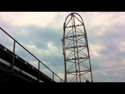 After lunch and finally starting to dry out a little from the snake river ride, we went towards the really cool ride I mentioned earlier. It is called the Top Thrill Dragster. It is based off the idea of drag cars. It jets you straight out 120 miles and hour and then up 90 degrees and 420 feet high with a twist in the track when it reaches the summit of the ride you head back down looking straight down at the ground before it levels out and brings you to a screeching halt. It lasts about 30 seconds and you stand in line for at least an hour or more. Go figure?!?! So there we are standing in line and at is point Ksenia is still planning on going. It's hot and humid and we are feet away from the covered area and the gates when the skies start to darken and the park goes quiet. Everything stops . . . literally. There are no roller coasters going anywhere in the park. It is kind of weird. They shut everything down. Apparently this is normal. The guy announces we can wait or leave it is up to us. People start leaving which puts us closer to the gate, but not inside the gate and the rain starts pouring and I mead POURING. Now from Oregon this is not really a big deal, except we just got basically dry and we were drenched again and the guy wouldn't let us in the covered area. He about had a riot on his hands from the natives, until people finally just walked through the gates to get out of the rain, which we did. We waited and once the storm passed, which was rather quick we heard rides start up again, except ours. It had mechanical failure. We waited a little longer but then gave up and headed out to enjoy some more rides in our very wet clothes, which did eventually dry. Being the dragster was the tallest ride in the park, we kept an eye out to see if it was starting up again.